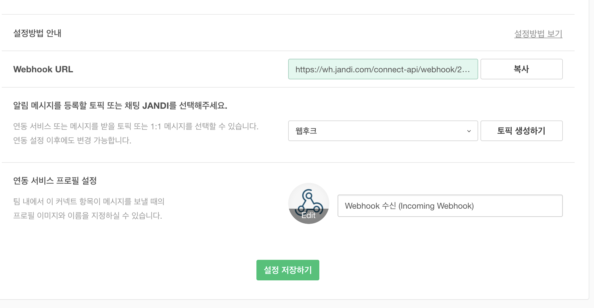 여기서 Webhook URL이 정보를 보낼 주소다. 그리고 그 아래에 알림을 보내고 싶은 잔디의 토픽을 선택하고 설정을 저장하면 된다.