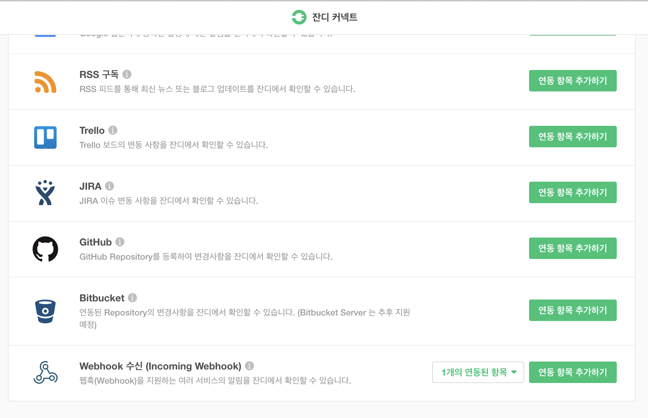 잔디 우측에 플러그처럼 생긴 버튼을 클릭하면 아래처럼 잔디 커넥트 서비스들을 확인할 수 있다.