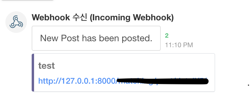 #views.py url = "http://" + request.get_host() + reverse('detail', args=[post.pk]) payload = '{"body":"New Post has been posted.","connectColor":"#6C639C","connectInfo":[{"title":"' + title + '","imageUrl":"' + url + '"}]}' headers = {'Accept': 'application/vnd.tosslab.jandi-v2+json', 'Content-Type': 'application/json'} r = requests.post("https://wh.jandi.com/connect-api/webhook/20949533/f0950aa5be2692b72ba34e8003e2b2f1", data=payload.encode('utf-8'), headers=headers) return redirect('detail', pk=post.pk)여기서 post.pk, title, url 같은 값들은 내가 같은 함수 내에서 지정해준 값이다.