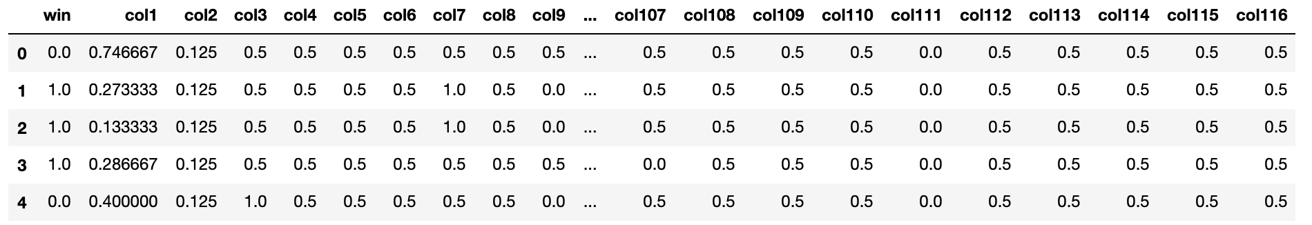 names = ['win'] for i in range(1, 117): names.append('col'+str(i)) df = pd.read_csv("data/dota2Train.csv", names=names) df.head()