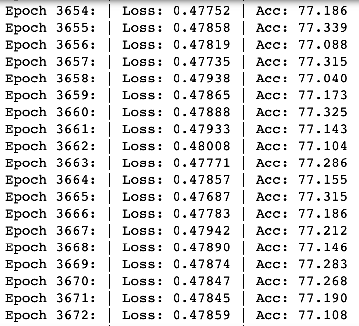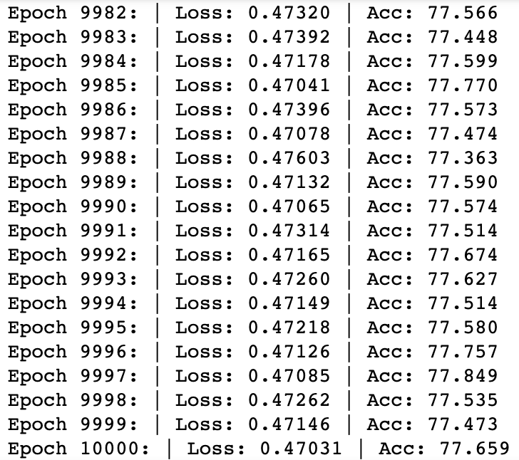 epoch 9982-10000 However, one thing to note is that the accuracy has been on 77% since epoch around 3600, therefore, there hasn't been much improvement for 7000 epoch. It would have been more reasonable to end the training when there wasn't significant improvement in the training.
