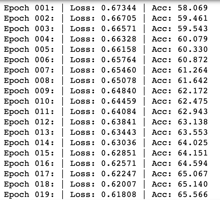 model.train() for e in range(1, EPOCHS+1): epoch_loss = 0 epoch_acc = 0 for X_batch, y_batch in train_loader: X_batch, y_batch = X_batch.to(device), y_batch.to(device) optimizer.zero_grad() y_pred = model(X_batch) loss = criterion(y_pred, y_batch.unsqueeze(1)) acc = binary_acc(y_pred, y_batch.unsqueeze(1)) loss.backward() optimizer.step() epoch_loss += loss.item() epoch_acc += acc.item() print(f'Epoch {e+0:03}: | Loss: {epoch_loss/len(train_loader):.5f} | Acc: {epoch_acc/len(train_loader):.3f}')I wanted to see how high the accuracy can rise to with given enough epoch. Therefore, I set the epoch as 10,000 and then trained the model. It took over 20 hours. The observation is that the accuracy started as 58.07% and rose up to 77.85% towards the end.