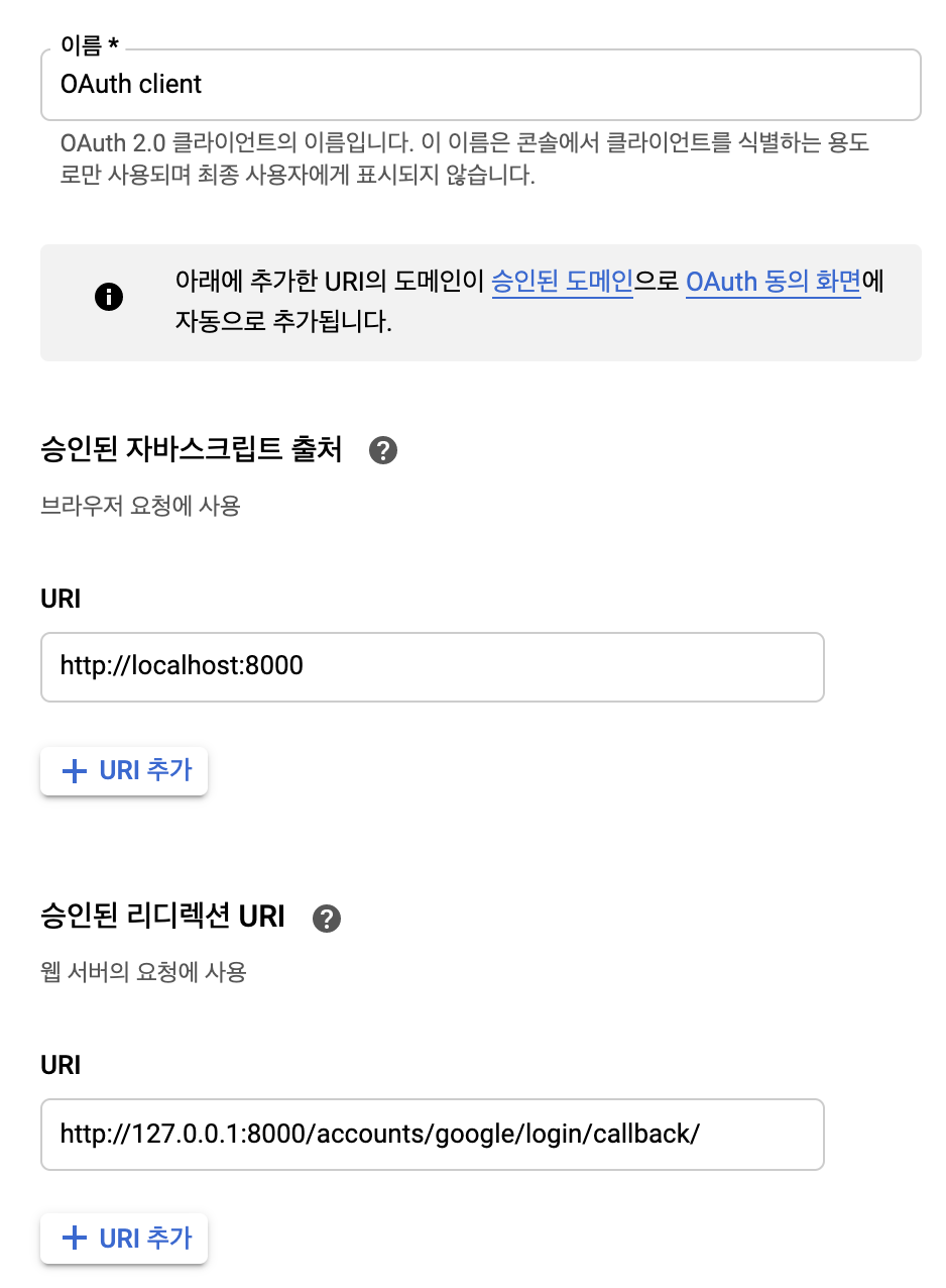 저기서 생성된 OAuth client를 클릭하면 아래와 같은 내용들이 뜰 것인데 승인된 자바스크립트 출처에 사용할 서버 주소, 즉 현재는 http://localhost:8000 을 추가해준다. 또한 승인된 리디렉션 URI에는 http://127.0.0.1:8000/accounts/google/login/callback/ 을 입력해주면 된다.