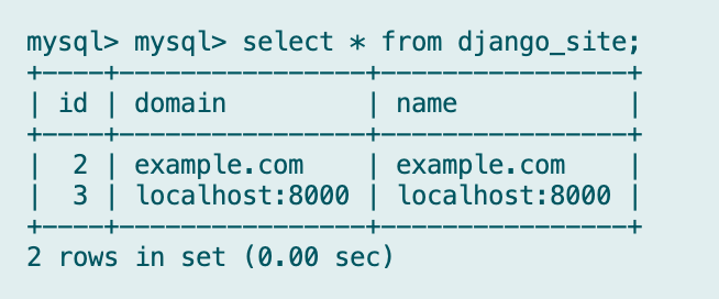 구글 클라우드에서 OAuth 클라이언트 설정을 저장하고 django admin에서 social application을 추가하고 나면 이제 거의 완료되었다. 다시 http://127.0.0.1:8000/accounts/login/ 에 가서 google 로그인을 클리해서 구글 로그인 페이지가 뜨는 경우도 있고 아닌 경우도 있다. 안뜨는 경우에는 django의 DB의 django_site 테이블에서 localhost:8000의 ID가 몇번인지 기억해보고 settings.py에 가서 해당 ID로 바꿔주면 된다. 본인의 경우에는 아래처럼 ID가 3이기 때문에 settings.py에서 SITE_ID를 3으로 바꿔주었다.