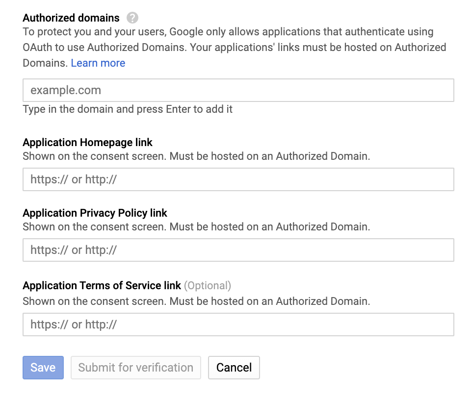 도메인주소가 있다면 google cloud console에 가서 API & Services - OAuth consent screen에 가서 바로 추가할 수 있지만 도메인 주소가 없다면 아래의 항목에서 한계에 부딫힐 것이다.
