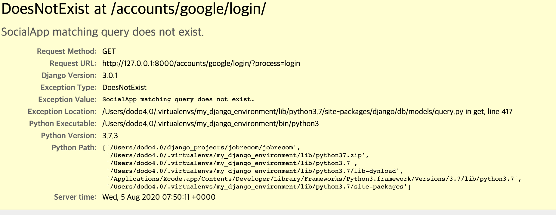 서버의 admin page ( http://127.0.0.1:8000/admin )에 가서 social applications를 추가해야 한다.