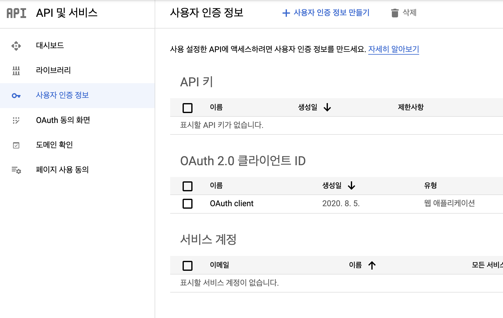 그리고 Google Cloud Platform (https://console.cloud.google.com)에서 API 및 서비스 - 사용자 인증 정보에 가면 아래처럼 OAuth 2.0 클라이언트 ID가 생성되어 있을 것이다.