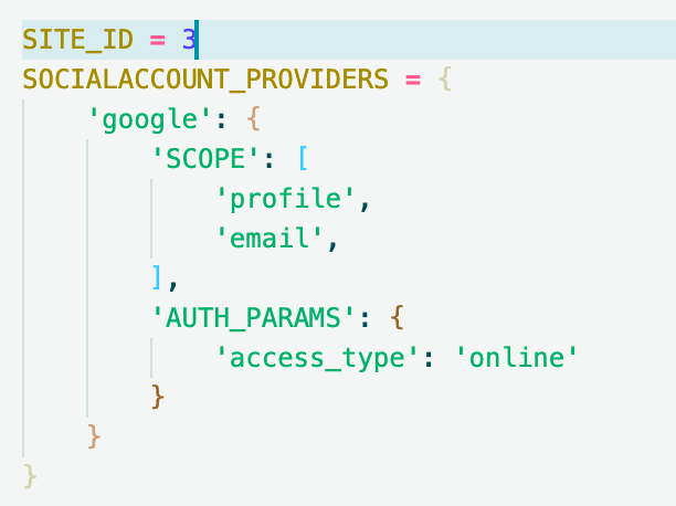#settings.py # Specify the context processors as follows: TEMPLATES = [ { 'BACKEND': 'django.template.backends.django.DjangoTemplates', 'DIRS': [], 'APP_DIRS': True, 'OPTIONS': { 'context_processors': [ ... 'django.template.context_processors.request', <- 추가해주기 ! ... ], }, }, ] AUTHENTICATION_BACKENDS = [ ... 'django.contrib.auth.backends.ModelBackend', 'allauth.account.auth_backends.AuthenticationBackend', ... ] INSTALLED_APPS = [ ... # 없으면 추가해주기 'django.contrib.auth', 'django.contrib.messages', 'django.contrib.sites', ... 'allauth', 'allauth.account', 'allauth.socialaccount', 'allauth.socialaccount.providers.google', ... ] SITE_ID = 1 #일단은 1이라고 해두었지만 바꿔야 할 수도 있다 (아래에서 더 적겠음) SOCIALACCOUNT_PROVIDERS = { 'google': { 'SCOPE': [ 'profile', 'email', #저는 email 주소 정보도 받아오고 싶어서 추가해줬습니다 ], 'AUTH_PARAMS': { 'access_type': 'online' } } }그리고 project/urls.py 에 가서 allauth에 관한 url path를 추가해준다.