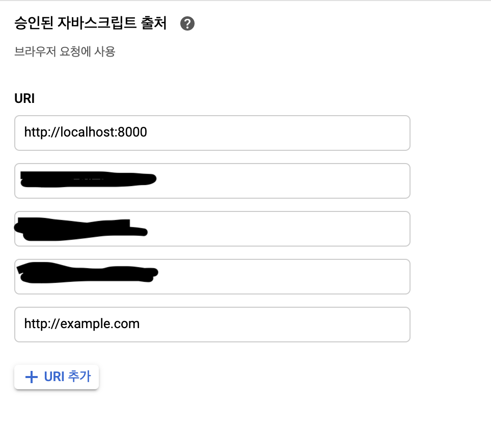 아까 생성했던 Google Cloud Platform - API 및 서비스 - 사용자인증번호에서 OAuth 2.0 클라이언트에 가서 사용하려는 서버의 주소를 아래의 example.com처럼 더해주고