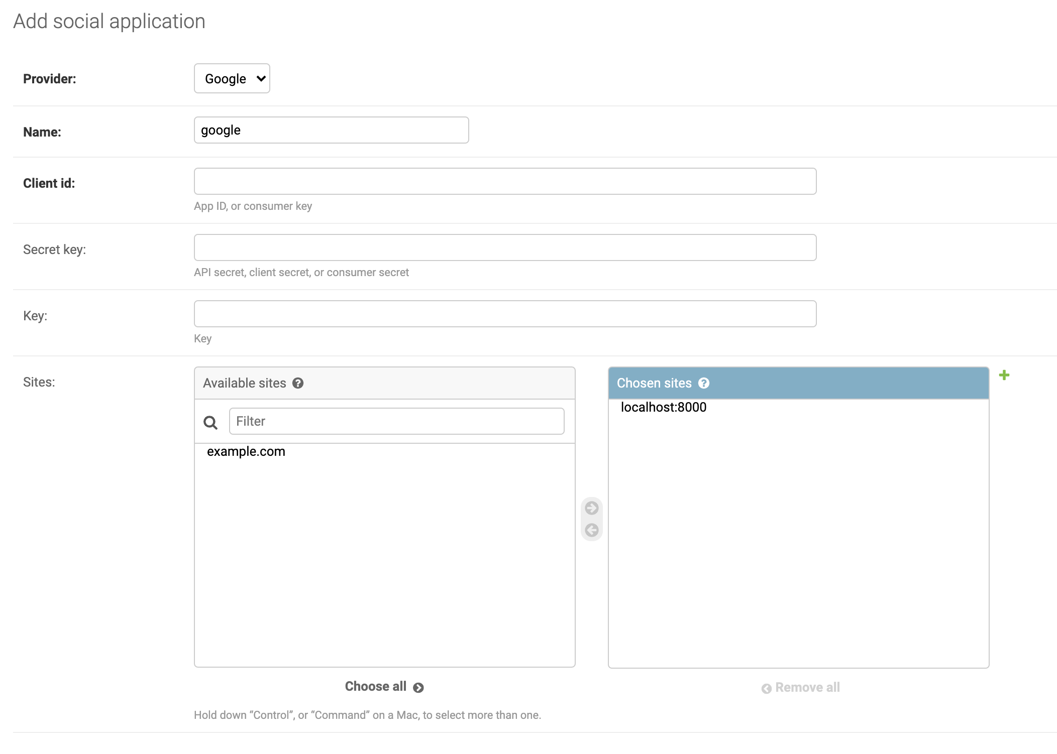 추가 버튼을 누르면 아래와 같은 페이지가 뜨는데 우리는 google 로그인을 할 것이기 때문에 provider를 Google로 하고 name은 아무렇게나 지정해줘도 된다. Sites는 현재 localhost:8000이기 때문에 localhost:8000을 chosen sites에 넘겨준다. 만약에 존재하지 않는다면 + 버튼을 눌러서 추가해주면 된다.